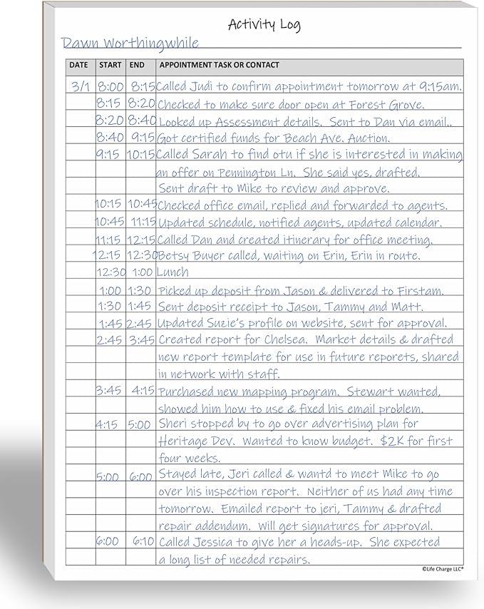 - Activity Log Notepad. These activity log books are helpful for work, home, personal and professional use. The format of this activity log allows for tracking date, starting time, and ending time. Use a single line or multiple lines to describe the appointment, task, or contact. It has a blank line at the top of each sheet to title each activity log sheet. Use one or many sheets for each project. FINALLY, a versatile activity log that can be used for many purposes and timeframes.