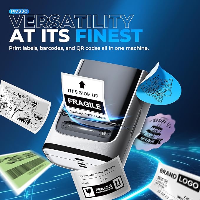 - Powerful APP- The PM220 label maker machine with tape comes with label templates and can set up your own templates. This label printer allows you to customize and format labels, supporting various features such as QR codes, barcode labels, tables, materials, time, figures, text, icons. This label maker machine with tape APP included more than 90 +Fonts, 14+ Languages, 450+ Materials. Please do not tear or destruct the green sticker on the back of the label strip, otherwise it will affect the printing effect