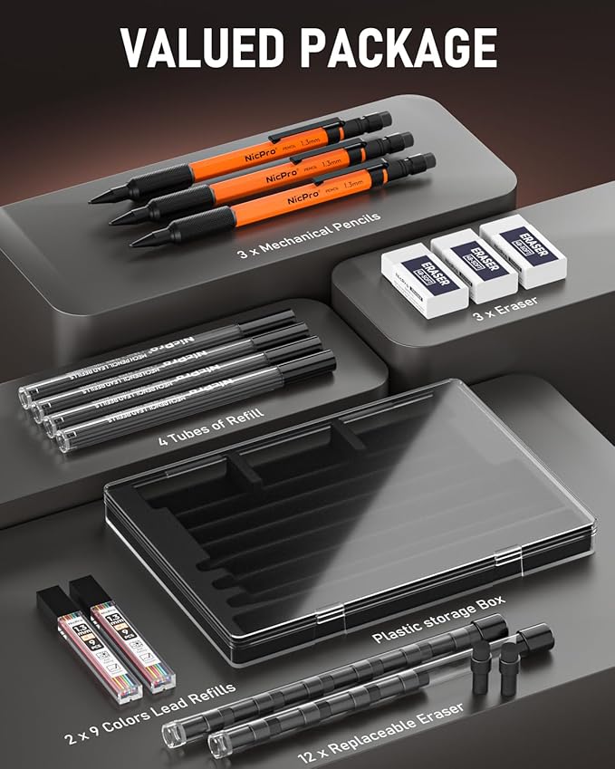 - Mechanical Pencil Set: Come with 3pcs 1.3mm orange mechanical pencil, 3pcs 4B eraser, 12pcs eraser refill, 4 tube of lead refills (12pcs/tube, 120mm length ) and 2 tube x 9 color lead refills. There is also a plastic pencil case included,a realistic set for field work