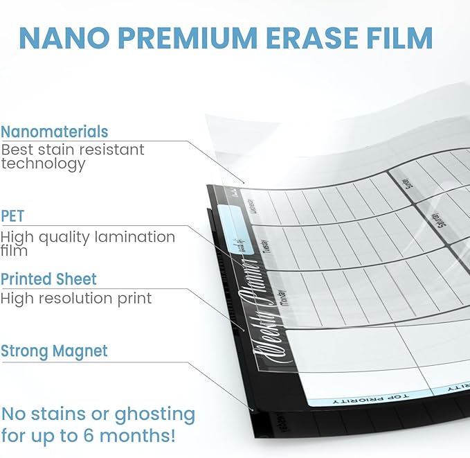 - Erases easily - Our calendars use premium nano erase film, making it incredibly easy to wipe off notes, even those that have been written for a long time. No residue, no fuss.