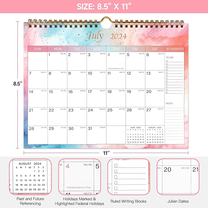 - MONTHLY OVERVIEW: With 18 months pages featuring 12 different color schemes, this 2024-2025 calendar's monthly overview page includes past and future monthly references, highlighted federal holidays that help remind you of important holidays and manage your life efficiently. And the grid includes Julian dates for long-term planning.