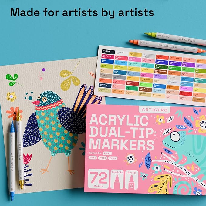 ARTISTRO 72 Acrylic Paint Markers for Fabric, Rocks, Paper, Wood, Canvas, Glass, DIY - Safe for Kids Dual Tip Acrylic Paint Pens (Dual Tip Dot + Brush, 72)