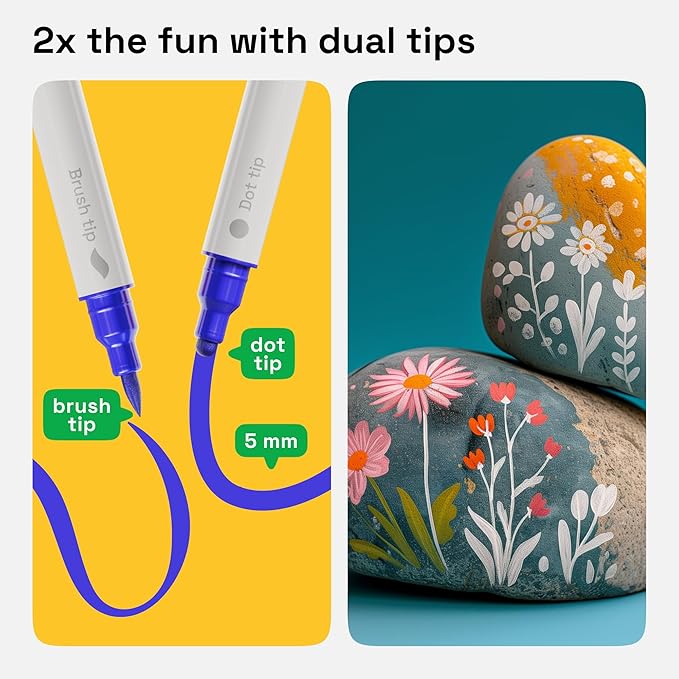 - DUAL TIP: Our acrylic paint markers come with 2 tips for 2x the fun. The acrylic paint pens are equipped with a dot tip and a brush tip. Get the most out of your paint pens acrylic markers with a vibrant palette of colors!