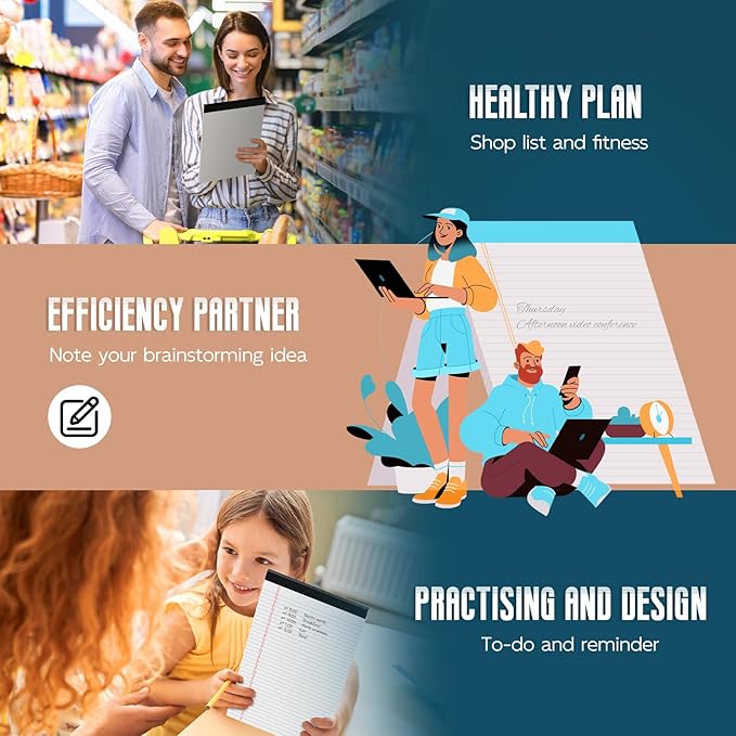 - 【Quantity & Size】Each package of white legal pads 8.5 x 14 comes with 6pcs white paper pads. Wide ruled (11/32 inches) 9mm line writing pads 8.5 x 14 provides plenty space for your notes, spacing makes it easy to write more notes on each sheet. Each lined paper pads 8.5 x 14 contains 30 sheets of 60 pages, totaling 360 pages. Legal note pads 8.5 x 11 giving you plenty of space to record your thoughts and ideas.