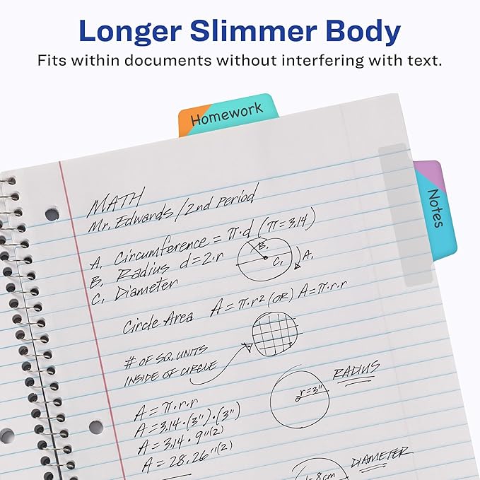 - Special Feature : Margin tab design, clear body, pre-printed subject tabs, blank colored tabs, removable self-adhesive, writable with most pens, pencils, and highlighters Margin tab design, clear body, pre-printed subject tabs, blank colored tabs, removable self-adhesive, writable with most pens, pencils, and highlighters