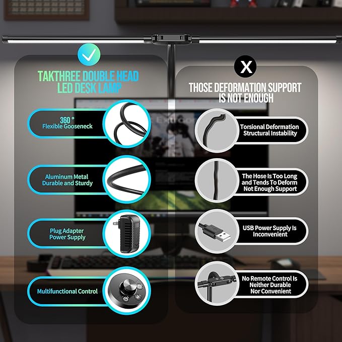 - 【Adjustable Dual Head】TakThree dual-head LED desk lamp provides two flexible and adjustable lamp heads, allowing you to freely adjust the direction and angle of the light. Whether for reading, studying, or working, desk light delivers satisfying illumination and ensures optimal eye protection