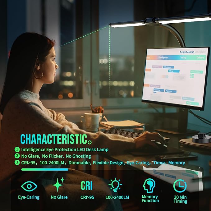 24W LED Desk Lamps for Home Office, Ultra Bright Double Head Architect Task Lamp with Clamp, Desktop Stepless Dimmer 50 Lighting Modes Adjustable Flexible Gooseneck Desk Light
