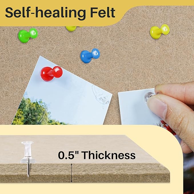 - High-Density Felt Board: Our cork bulletin board features a high-density 1/2 inch thick felt construction that holds up against multiple nailing without visible holes, and push pins will not go through your corkboards or break your wall, durability and longevity