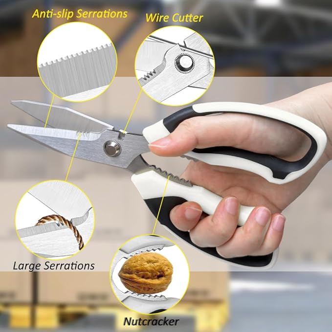 - Multi-Functional Cutting Tools: Versatile heavy-duty scissors can easily cut a variety of materials, grooves on the blade are designed to cut wire, and the gears on both sides of the handle can also be used as walnut clips.