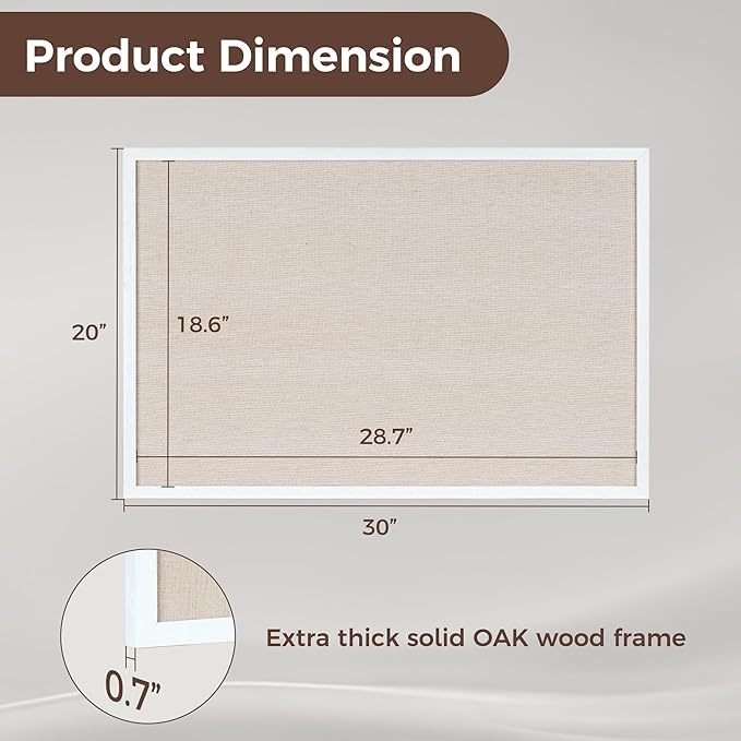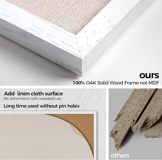 - OAK-Frame Material: Our cork boards for walls is made of 100% Oak wood which has well self-healing ability and repairability. The pin board features a four-ply splint design that is strong and thick enough not to be punctured by thumbtacks.