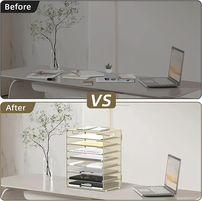 - [Perfect Paper Organizer] The 9-tier paper tray desk organizer has a large capacity for all your office supplies and accessories, such as: letters, paper, printing paper, books, folders, bills, magazines and so on. Keep your desk away from clutter and increase your productivity.