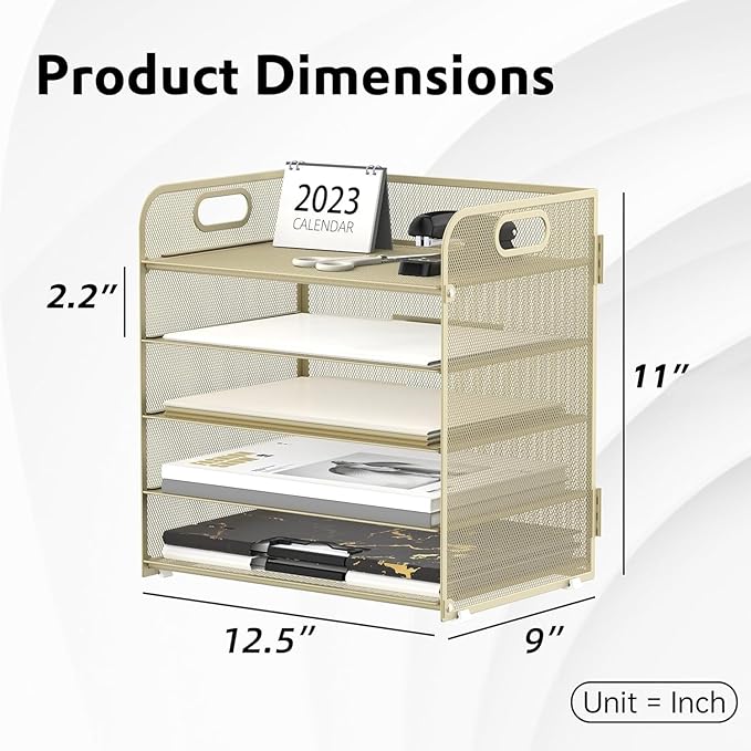 Supeasy 5 Trays Paper Organizer Letter Tray with Handle-Mesh Desk File Organizer,Pink Paper Sorter Desk Organizer for Office, Home or School (Gold Yellow)