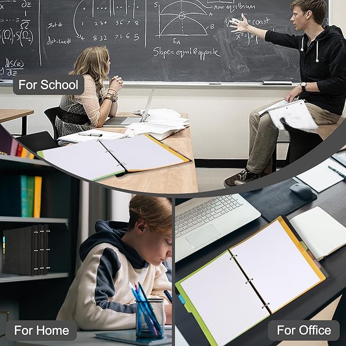 - 【Binder with Dividers】This notebook with dividers and pockets comes prefilled with 30 pieces of 8.5"x 11" college ruled paper, 30 graph papers, 5 colored tabbed dividers with pockets, and 1 movable pouch. This 3-ring notebook's dimensions are 11.6" x 10.4". Normally, in back-to-school season, you need to buy 5 subject notebooks and 1 binder, but now, with this all-in-one notebook, you only need to bring one, which can greatly save your backpack space.