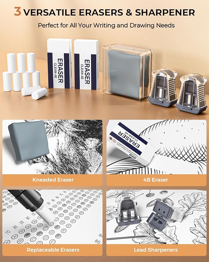 - Durable Erasers & Sharpeners: The pencil set includes 2 high-quality 4B erasers, 1 kneaded eraser, and 2 tubes of eraser refills (9 pieces/tube) for clean, precise corrections. 2 double-hole lead sharpeners are included for versatile tip maintenance, while each 2.0mm pencil cap features a built-in sharpener for quick on-the-go adjustments