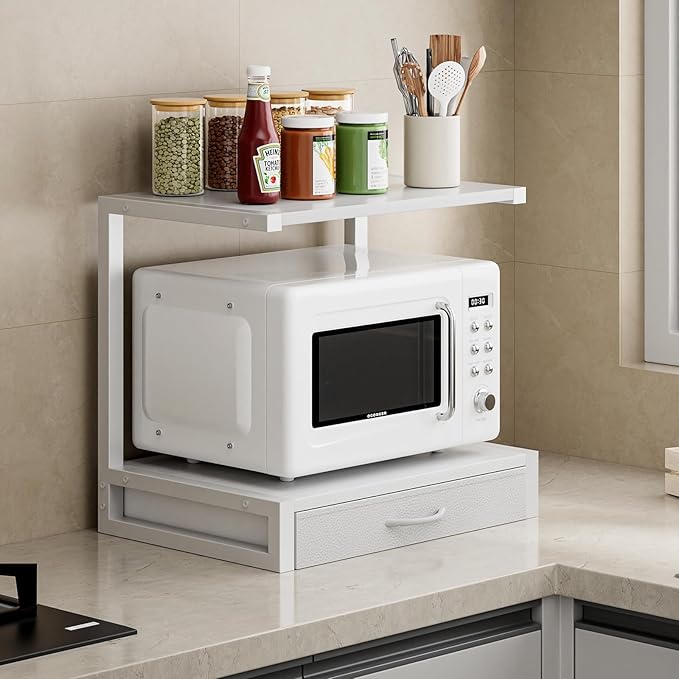 2-Tier Desktop Printer Stand with Fabric Drawer, Prtiner Table with Storage Shelf, Desk Organizer for Home Office,3D Printer,Fax Machine,Scanner, 17.3"x11.8" White
