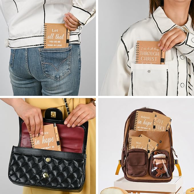 - Product Information: The compact and small notebook size is 4.13 x 5.43 inches / 10.5 x 13.8 centimeters, making it easy to fit into pockets, handbags, or car glove compartments. The pocket notebook features a sturdy cover, 50 inner pages, and a Christian pens, making it convenient, practical, and not easy to lose