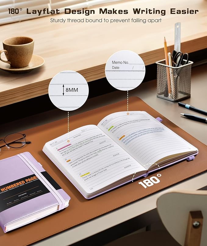 - 【180° Lay Flat Design】The 180° lay flat design, combined with a sturdy thread-bound binding, the leather notebook can easily to lay out flat makes taking notes more efficient, reading more convenient, which provide a comfortable writing experience. Rounded corner design makes the lined notebook not easy to be damaged and curled. Standard 8mm space classic college ruled journals, each journal page has “Memo No” and “Date” header to help you keep track of the date.
