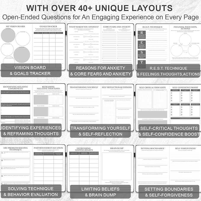 - PERFECT GIFT FOR MENTAL WELLNESS & PERSONAL GROWTH: Suitable for both women and men, this journal helps manage anxiety, build confidence, foster self-compassion, and offers a creative outlet for self-expression. It's a thoughtful and meaningful gift for anyone interested in mental health, whether they're actively working on their well-being or new to the idea.