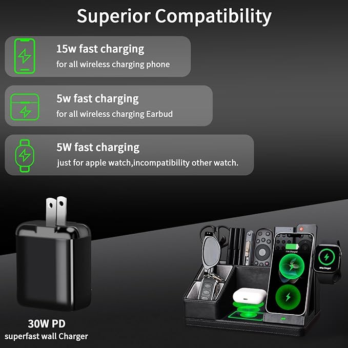 - Convenient Charging for Your Devices: Say goodbye to cluttered cords! Our organizer includes dedicated charging docks for your iPhone, Apple Watch, and AirPods, offering fast and wireless charging solutions. Simply place your devices on the designated charging areas for effortless charging.