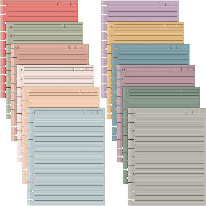 PerKoop 12 Pack 480 Sheets Colored Discbound Refill Paper 8.5 x 11 Inch College Ruled 11 Disc Letter Size Lined Paper Multicolored Refill Notebooks Disc Paper for Refill Paper Journaling (Retro Color)