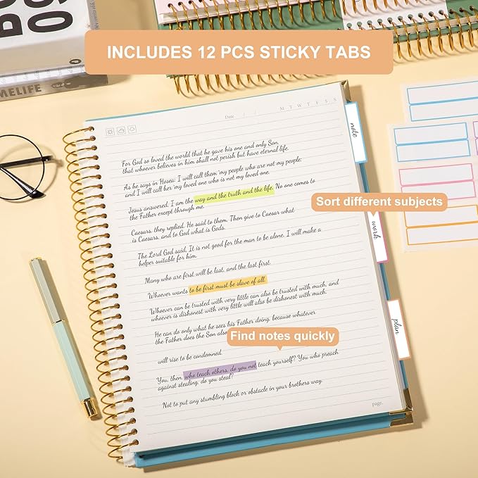 - Upgraded Lined Journal Notebook: Note book comes with 12 pcs colored tab stickers. You can create sections to organize multi subject and quickly locate desired parts. With an elastic closure band, keep the covers closed and secure when not in use, also great for keeping your place as bookmark. The back cover includes a pocket for cards and note-taking notes.