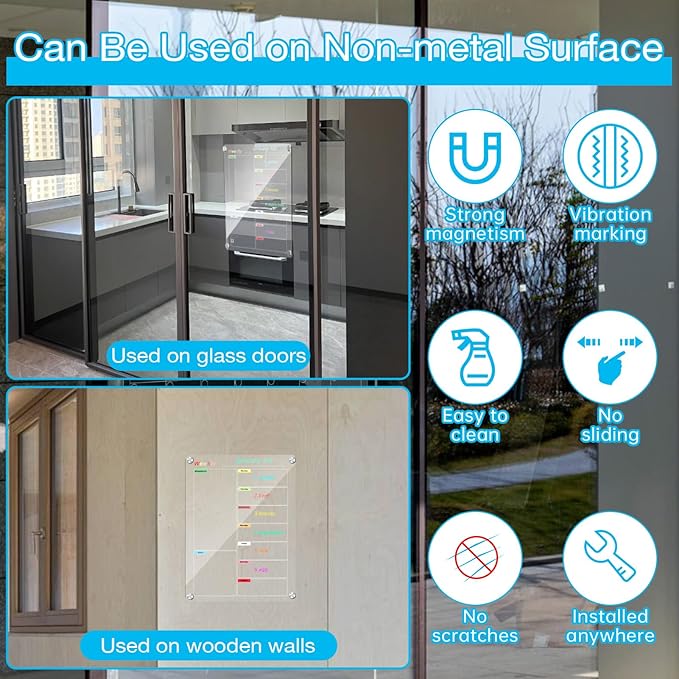 - 【Acrylic Calendar with Strong magnetic Strips】 The acrylic refrigerator calendar board back with dedicated full-wrapped magnetic strips protects the fridge from scratches and damage. Its powerful magnetism ensures a secure grip on the fridge surface and firmly attaches to any flat magnetic surface for versatile uses.
