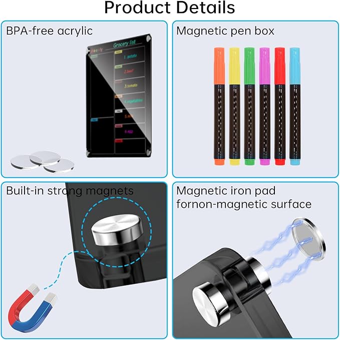 - 【Effortless Writing & Enhanced Clarity】 With four vibrant markers in 6 colors, you can smoothly jot down your daily plans on the magnetic calendar board and conveniently organized them in the magnetic pen case when not in use. Paired with the sleek black acrylic calendar board ensures a clear clarity and visibility.