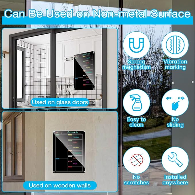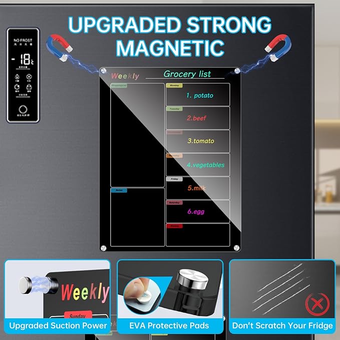 - 【Acrylic Calendar with Strong magnetic Strips】 The acrylic refrigerator calendar board back with dedicated full-wrapped magnetic strips protects the fridge from scratches and damage. Its powerful magnetism ensures a secure grip on the fridge surface and firmly attaches to any flat magnetic surface for versatile uses.