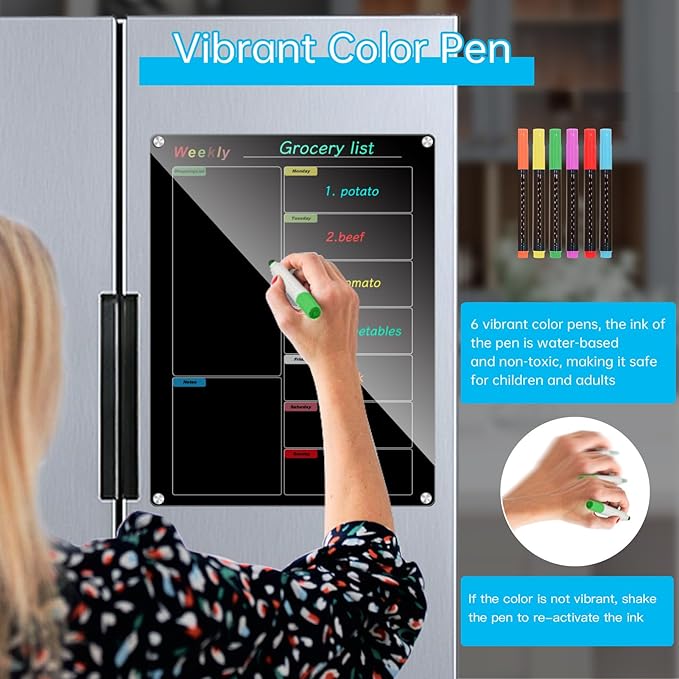 Fridge Calendar Meal Planning Board, Dry Erase Acrylic Magnetic Monthly Weekly Calendar Planner for Refrigerator with 6 Colors Markers (Black-Weekly(15.7x11.8))