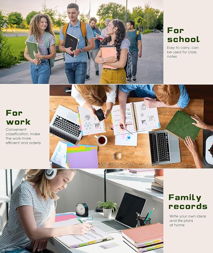 - 【Hardcover Notebooks for Work School】This spiral 5 subject notebooks is an excellent choice for students, professionals, or anyone who like to write things down and needs to keep them organized. A stylish look with gold color stamp font,binding brighten up your dreary desk,also a wonderful gift to work organization, back to school or family records.