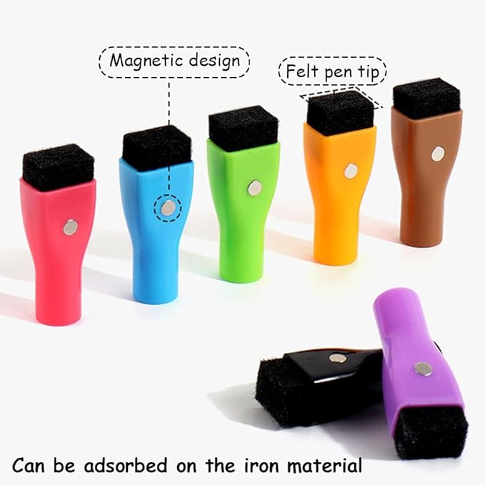 - Products included:4 pcs magnetic dry erase board (12*8 inches), 6 pcs colorful magnetic markers (each pen has a small eraser on the cap)+ 1 bone shaped magnetic board eraser. All products are magnetic and can be freely attached to the refrigerator or metal surface