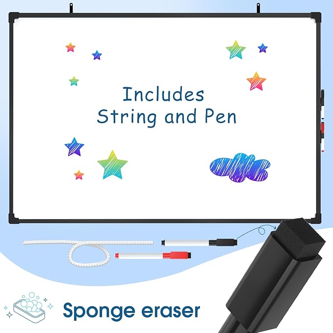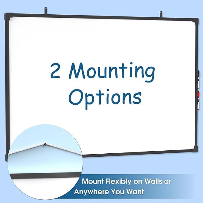 - Convenient Mounting and Included Pen: The frame is designed with hooks around it and is equipped with a lanyard so it can be hung horizontally or vertically as you want. This whiteboard can be easily mounted on walls or other suitable surfaces. Additionally, it comes with 2 complimentary markers eliminating the need for users to purchase one separately and providing instant usability for enhanced convenience.