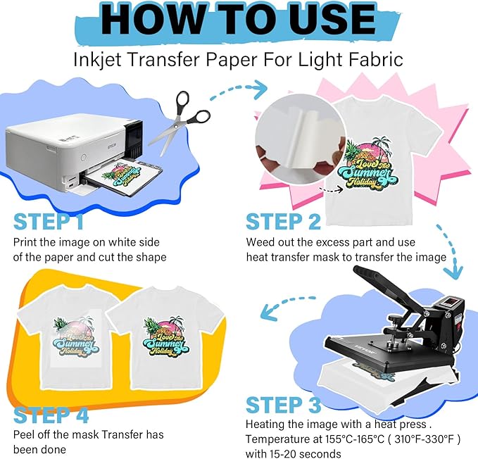 - Easy to Use Iron on Printer Paper for Fabric: Apply your creative ideas effortlessly with our printable htv custom iron on transfers for beginners and experienced users. Printable iron on vinyl printable htv vinyl for inkjet printer is perfect for customization projects with just an inkjet printer and a home iron. Heat press settings: 310-330°F for 15-20 seconds.
