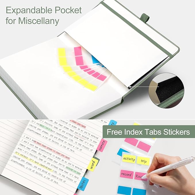 - CONVENIENT AND PRACTICAL LAYOUT: Includes numbered pages and contents pages for easy navigation and organization. Features a pen holder for easy access to your pen, an elastic band to keep your notebook securely closed, 2 bookmarks for quick page referencing, an inner pocket for storing loose papers, and 18 sticky notes for additional organization and reminders