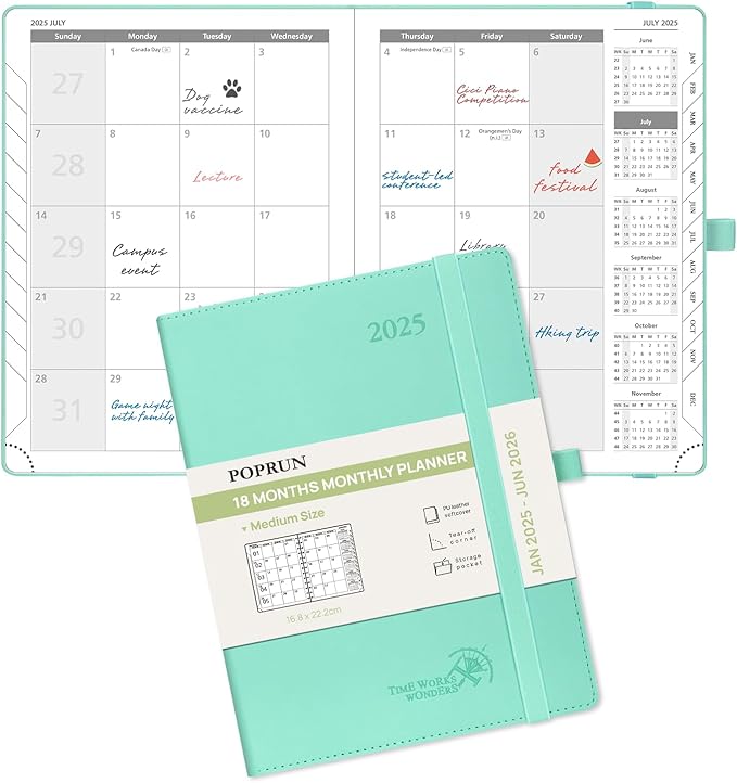 POPRUN Monthly Planner 2025-2026 (Medium- 6.5'' x 8.5'' Soft Cover), 18-Month Calendar Book (January 2025-June 2026), Calendar Planner with Monthly Tabs & Pocket, 100 GSM Paper - Green