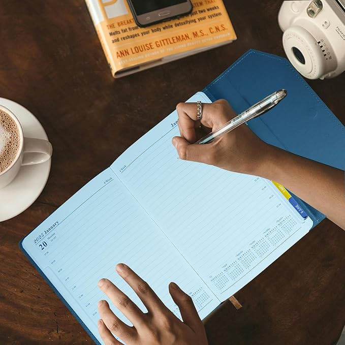 2025 Daily Monthly Planner - Calendar, January - December 2025, 100GSM Thick Paper, Leather Cover, Planner with Hourly Schedule,6.1" x 8.2", Daily Inside Page - Monthly Inside Page, Pen Holder, Bookmarks (Light blue)