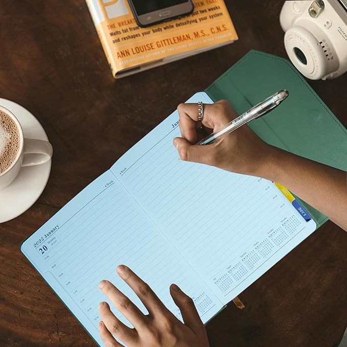 2025 Daily Monthly Planner - Calendar, January - December 2025, 100GSM Thick Paper, Leather Cover, Planner with Hourly Schedule,6.1" x 8.2", Daily Inside Page - Monthly Inside Page, Pen Holder, Bookmarks (Matcha green)
