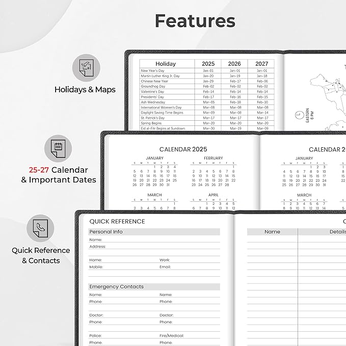 - Additional Features - The weekly planner includes 2025-2027 calendars, holiday lists, contact pages, notes pages, important dates, and US time zone map.