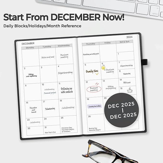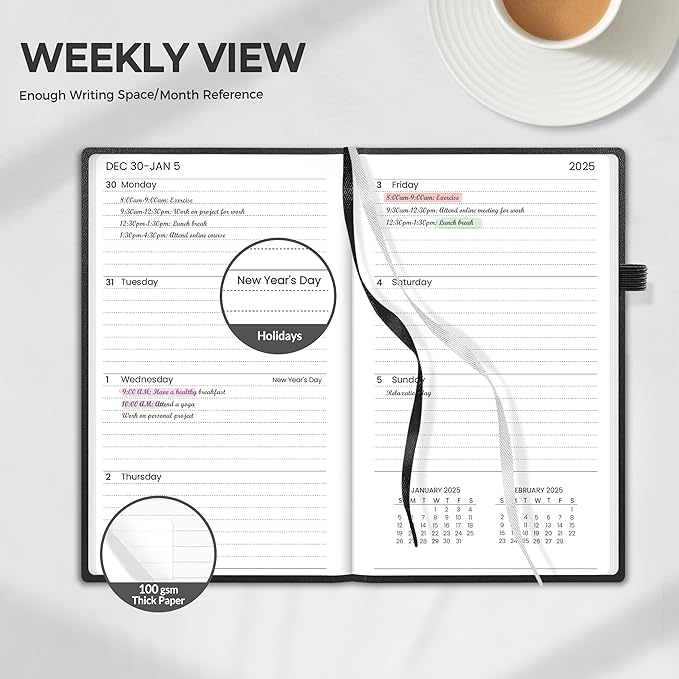 - Weekly View - 2-page weekly spread from Monday to Sunday provides generous lined writing space along with popular holidays and month reference previews, allowing for easy appointment, note, and daily task management.