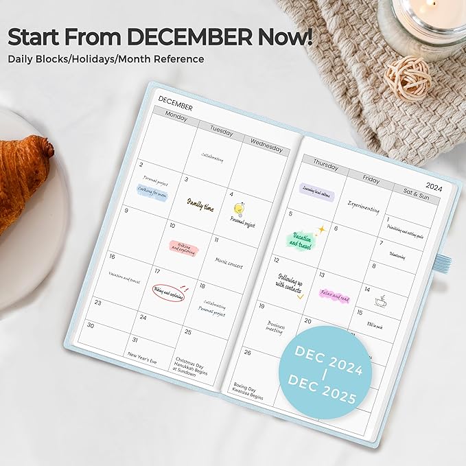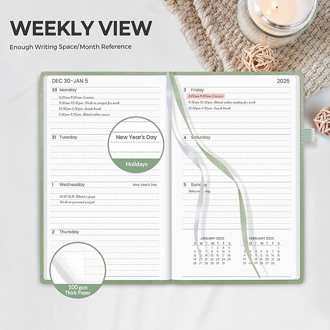 - Weekly View - 2-page weekly spread from Monday to Sunday provides generous lined writing space along with popular holidays and month reference previews, allowing for easy appointment, note, and daily task management.