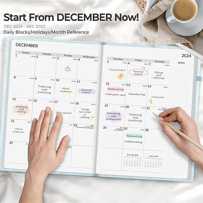 - Monthly View - Each date box provides ample writing space, daily blocks with popular holidays for easy long-term project and appointment scheduling. 2 ribbon bookmarks for easy navigation and finding.