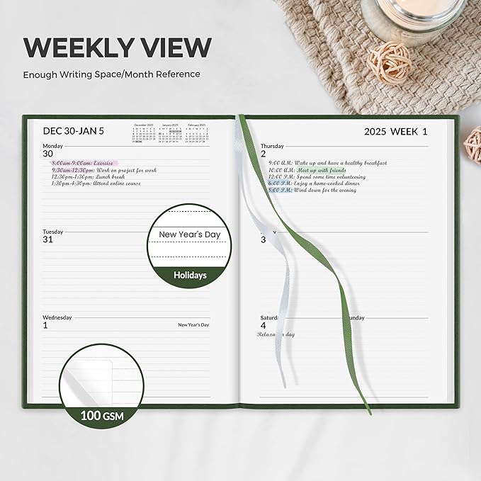 - Weekly View - 2-page weekly spread from Monday to Sunday provides generous lined writing space along with popular holidays and month reference previews, allowing for easy appointment, note, and daily task management.