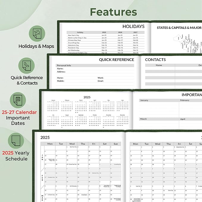 - Additional Features - The weekly planner includes 2025-2027 calendars, holiday lists, contact pages, notes pages, important dates, and US time zone map.
