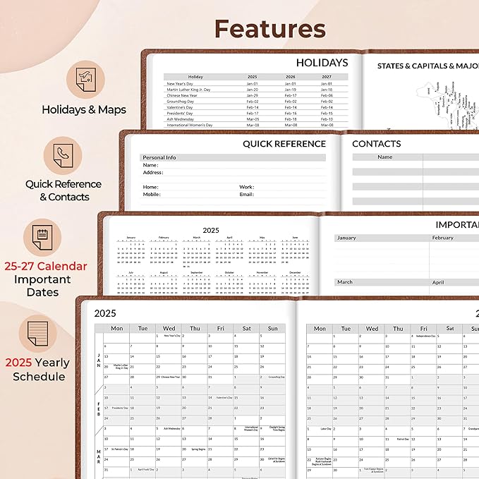 - Additional Features - The weekly planner includes 2025-2027 calendars, holiday lists, contact pages, notes pages, important dates, and US time zone map.