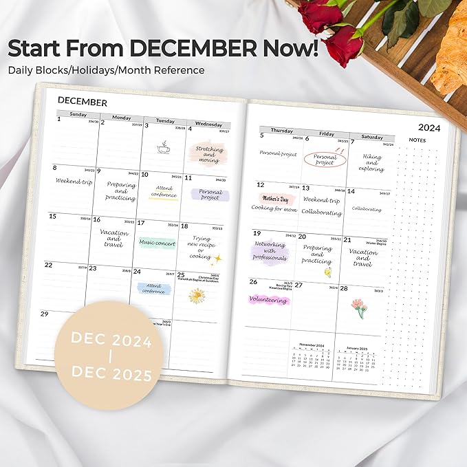 - Weekly View - 2-page weekly spread from Monday to Sunday provides generous lined writing space along with popular holidays and month reference previews, allowing for easy appointment, note, and daily task management.