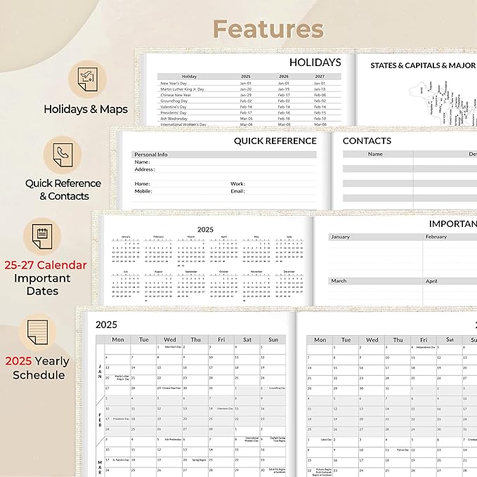 - Additional Features - The weekly planner includes 2025-2027 calendars, holiday lists, contact pages, notes pages, important dates, and US time zone map.
