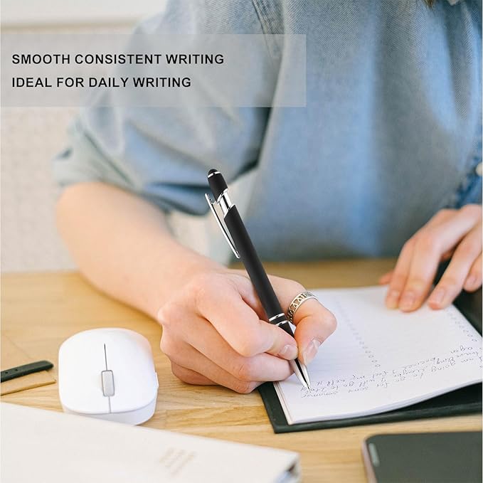 Linfanc 12 Pack Black Silver Ballpoint Pen with Stylus Tip, 1.0 mm Black Ink Smooth Writing Pens, Metal Stylus Pens for Touch Screens