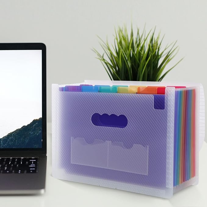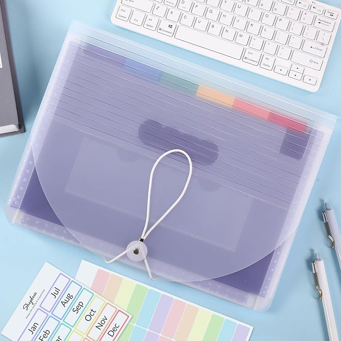 SKYDUE Accordion File Organizer, 12 Pockets File Folders, Letter Size Expanding File Folder with Colored Tabs and Expandable Cover (Transparent)