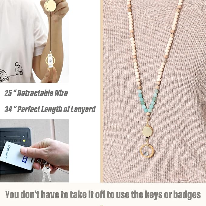 - Perfect Size & Retractable - This beaded lanyard for women measures approximately 34 inches perfect size, 25" retractable wire of the ID holder is great and you don't have to take it off to use the keys or badges.
