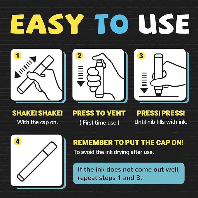 - Non-Toxic and Safe: SRUOLOC paint markers are non-toxic, Each thick chalk board marker pens meets ASTM d-4236 and EN-71 safety standards, are suitable for artists of all ages, working seamlessly on blackboard, glass, poster, and other non-porous surfaces come in a vibrant variety of colors for endless creativity. Dry & wet erase on non-porous surfaces (blackboard, glass)